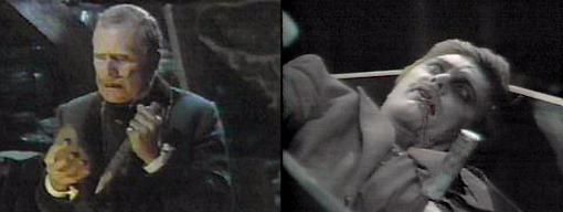 Edward quickly pounds the stake into Dirk's chest.  The vampire succumbs, eyes open, blood flowing from his mouth as he sags back into the coffin.  (Pretty graphic for DS.)