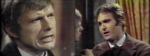 Tim says, that isn't such a good idea, is it?, focusing on Trask.  The latter suggests Judith just rest.  I can't, she says--you must call the police and tell them there are two murderers at Collinwood.  "She doesn't know what she's saying," says Tim.  Trask escorts him out, saying I have to speak to Judith, but don't do anything you'd regret, he advises.  He closes the double doors on Tim, dismissing him.  You must understand, he tells Judith--you had no control over what happened.  But I did kill her, says Judith, how do you think I feel?  How do you think I feel? asks Trask, for so many years I was responsible for Rachel's soul, may it rest well in heaven tonight. (oh, give me a break!)  I can't bear it anymore, says Judith, I want you to call the police and get it over with.  Be strong, he urges her, putting his hand under her chin and making her look at him--I have fought against evil all my life and recognizes the enemy--I know what the evil force wants you to do next--permit yourself to be destroyed because of Rachel's murder.  But I did it, objects Judith.  Only if you confess to the crime, only then will you be evil, says Trask, only then will you be lying--you didn't kill Rachel, Dirk did.  But Dirk is dead, says Judith.  And so is Rachel, says Trask--will it restore her for even one moment if you, Judith, are destroyed too?--and you could easily go to the gallows.  This horrifies Judith.  And if you died, says Trask, my life would be bleak, dark, meaningless, that I would soon die, too.  Do you mean that? she asks.  Every word, swears Trask--you should be silent--I will speak to the police myself.  What about Tim? she asks.  Relax, says Trask, I will do what has to be done.  You can't keep Tim from telling the police about me, says Judith.  Trask assures her, I can.  He picks up the phone.  There is a way, he says, asking for the sheriff's office.
