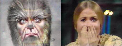 Charity screams shrilly, covering her mouth, sobbing. What's the matter? asks Tate. Look at the portrait, says Charity, voice trembling. He does. When she looks again, she says, I don't understand. (The portrait looks like Quentin again, not the wolf.) I was admiring the painting, explains Charity--I saw the face begin to change--Quentin's face turned into that of an animal, a wolf, I think. Tate, thinking her crazy, offers her a drink. You don't believe me, says Charity. You THOUGHT you saw something, he says. I KNOW I did! she cries. That is a canvas, says Tate--there's an image on it, that of a man, and the only way it can change is if I do it with my brush and oils. He hands her a drink. I know you think me crazy, says Charity. A wolf howls. Charity looks suddenly terrified. Tate hears it, too. No, I don't think you're crazy, he says, I think you've been the victim of the power of suggestion--you heard the howling of that animal and thought you saw the portrait change. She objects--I didn't hear the howling before I saw the portrait change! Tears are running down her face, and Tate is holding her. I know you had a bad scare, he says, and I'm trying to find a way to ease your mind (he touches her shoulder). Perhaps I did imagine it, she says, but it seemed so real. I'm sorry I left you alone in the room, he says. I'm sorry for my behavior, says Charity--it isn't a pleasant way for us to become acquainted. She puts on her shawl. You needn't apologize, he assures her. I'll leave, says Charity--I'm sure you have plans for the evening. He insists on escorting her back to Collinwood. She accepts, grateful for this thoughtfulness. They leave.