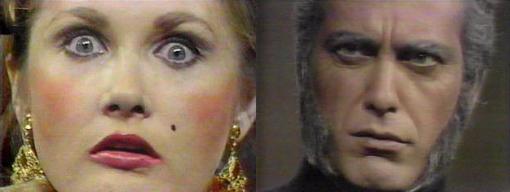 --if you will say no more, I must remain what I am, a restless spectator in a play about to begin--I sit in my seat, staring at the program, wondering what will happen onstage--but supposing there is NOTHING when the curtain rises but a bare stage?--allow me to make my meaning clear. Aristede comes in holding two flaming torches. In my time, explains Petofi, I destroyed entire gypsy villages with them--with them, I could burn Collinwood to the ground--what need of the building if there are no Collinses?--if Jamison dies, there will be no Elizabeth, Roger and David, all will cease to exist in 1969!--I have studied my history very carefully. "I see," says Barnabas--I am surprised, I expected better from you--"You are incompetent." "How dare you call me incompetent?" snarls Petofi. "In one night I could destroy a whole generation of Collinses." Aristede, holding the torches, offers to go to Collinwood right now--I will do the job quickly, accurately and efficiently. Think about it, Petofi advises Barnabas--no Collinwood, no Collinses!--ask yourself, suggest the count, if your secret is worth as much as that...