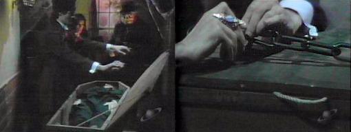 Dawn - Magda leads Petofi and Aristede into an unused wing of the family mansion. There's a coffin there, apparently Barnabas' new hiding place. "We can learn from Mr. Collins," says Petofi--this is an ingenious move on his part. Yes, you can, agrees Magda. Aristede takes out a length of chain. Silence! Petofi orders Magda--I am the only one who can speak. Open the coffin, Aristede, orders Petofi. Aristede does so. Barnabas lies inside. Petofi takes a gold cross, says, "I'm afraid you are fighting a losing battle, Mr. Collins," and places it on Barnabas' chest. Aristede closes the coffin. "Chain him," orders Petofi, "chain him securely for his long..." (I could not make out the remainder of Petofi's statement; between the chain and the music, it was muffled).