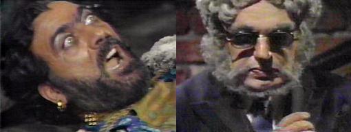 Johnny raises his scimitar and brings it down, laughing--but someone shoves a knife in his back--Aristede.  Johnny falls to the floor.  Relieved, Petofi calls Aristede a "dear, dear boy." Are you all right? asks Aristede.  Yes, thanks to your providential arrival, says Petofi--I owe my life to you--untie my wrist; it's uncomfortable.  Eyes glittering with hatred, Petofi reveals that Barnabas told Johnny about me--he betrayed me!--wherever he turns, Barnabas has contrived to make matters uncomfortable for me--we must deal with Barnabas, decrees Petofi, as soon as we deal with the gypsy on the floor.  I dealt with him rather well, brags Aristede, considering how far he was from the door. And I'll remember that, promises Petofi--now we must deal with this savage.  Aristede pulls out the knife and wipes the blood on Johnny's grand velvet cape.  "This one doesn't have long to go," says Aristede.  Did you hear that? Petofi asks the gypsy--I promised you things beyond your dreams, and you never dreamt you would die tonight, but you are, and I will kill all your kind that cross my path--they must learn to leave me alone and give me peace.  "No!" shouts Johnny hoarsely--"No peace for you, none!  You kill King Johnny, you think you are safe--think again--nine days after my spirit leaves the earth, I will return, and give the power to another gypsy somewhere, he will then have the power kill you--whoever he is, wherever he is, you will not know