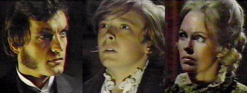 Charity joins Quentin.  Are you contemplating what life would be like with Miss Moon eyes? She asks sarcastically.  He pours himself a drink--leave me alone, he says.  You're not going to marry Angelique, and you know it, she says, you don't love her, you tried to tell her that, but she wouldn't listen--maybe she'd listen if I were to tell her it's me you love.  You haven't been yourself, says Quentin impatiently--you don't know what you're talking about.  She primps her hair--I've seen the way you looked at me, she says, I know how you feel about me, you can't hide it.  I'm not hiding anything, he says, I'm going to marry Angelique.  She curls her hands over his shoulders.  This isn't anything to be making jokes about, she says.  "I'm not making jokes!" yells Quentin, extricating himself from her touch.  She looks lost.  "You're really going to marry that...that woman?" she asks.  Yes, says Q.  I won't let you do it! cries Charity.  You can't stop it, he retorts.  She takes a letter opener into her hands--it's me you love, she says, not her!  She lunges at him with the letter opener.  They begin to struggle, Quentin not putting down the brandy glass.  He fights her one-handed, ordering "For God's sake to put that down!"  Edward enters and breaks them up.  Charity begins to cry.  Edward, clutching the letter opener, asks her, "How much of this madness must we endure?"  She's been like this for a week, explains Quentin-- another example of Petofi's unique powers--perhaps it will convince you that something must be done about the Count.  Leave the room, demands Edward, I'll deal with Charity.  Edward closes the doors and addresses her as Miss Trask.  She shushes him, ordering complete silence so she can concentrate on the future.  It's coming to her, and it's the very near future that concerns us--the 10th of September, yes!  The 10th of September.  She sees this house (as do we), it's very late at night, there's a storm coming, the house is dark, but not everyone is in bed.  She hears music, Quentin's music, coming from downstairs.  Now, someone is coming into the house.  It's Angelique!  The latter opens the drawing room doors, calling to Quentin--she's been waiting for him at the cottage.  She finds his portrait, and gasps--blood is running from the chest!  There's blood on the floor, too.  Angelique follows the trail of crimson into the foyer, up the stairs, over the landing, following drops of blood like grotesque crumbs.  She opens the tower room door--there is Quentin, lying with a huge bloodstain on his chest.