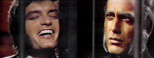 "Trask," he says, "let me out of here! You've gone too far!" Trask insists, I can't, you are the werewolf. "I'm the WHAT?" asks Q. Yes, you told me so yourself, says Trask. *I* did? asks Quentin, "Trask, are you sure you haven't been getting into the brandy?" He points accusingly at Trask. I know what I saw in your room, says the Rev. What about the moon you just saw? inquires Q, smiling--obviously this desire to take over Collinwood has warped your mind, with or without brandy--"NOW, I SUGGEST YOU LET ME OUT, RIGHT NOW!" Trask refuses, I know I have the right man in the cell, and I want to keep you here until morning. Do that, vows Quentin, and YOU'LL be the one in jail--I already have a variety of charges--assault and battery, imprisoning a man in his own home, accusing a man of being a werewolf. . . All right, agrees Trask, you're free to go, but I know what you are, and will see to it you're destroyed! Of course you wouldn't want to keep me locked up tonight, jests Quentin--I'm sure there are many things you have to do--it's such a beautiful, moonlit night. Quentin walks off, laughing.