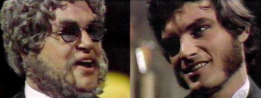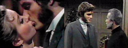Collinwood drawing room - Amanda hears a door slam. She pulls open the doors eagerly. It's Quentin, who realizes--you thought I'd be someone else--not the honorable Mr. Trask, I hope. She shakes her head. Tell me, he encourages--they don't have any secrets at Collinwood. (HA!) Mr. Tate, she replies. No, he's not for you, objects Quentin, smiling, he never enjoys himself!--you want someone who knows how to enjoy himself. He puts on his music. I played it earlier, she explains--a madwoman stopped me, insisting it was your song. He bows--may I have the pleasure of this dance? he asks. I shouldn't, she says. Don't you dance? he asks. I do, says Amanda. Then you have no excuses, he says. She moves into his arms. They begin to waltz. That's a pretty melody, she comments. I want to think of new words, happy words, he says, so every time I hear it, I think of you. Don't make them too happy, she cautions, tell me the ones you know now. He recites: Shadows of the night, calling silently, echoes of the past, calling you to me. Haunting memories, veiled in misty glow. . . At this point, they kiss. Trask catches them in mid smooch.