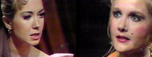 Charity washes her hands in a bowl as Trask, says, every moment you're like this is a disgrace to me, and I won't have it. Get that woman out of here, she orders. He refuses. Then I will leave, she says. Where will you go? he asks, wherever the devil leads you? That woman is going to cause great trouble here, warns Charity. She's staying, insists Trask, and there is nothing you can do about it--I'm doing my duty and neither you nor anyone else will stop me. "You'll regret it if I leave," says Charity. If you leave, you'll soon learn how cruel the world is, predicts Trask. She bursts into laughter. You will come begging me to take you back! he assures her as she continues to laugh--one hour in the outside world will make you realize who you are! That stops her laughter; she returns to fury mode. I know who I am, all right, she blares--I'm Pansy Faye and I take no guff from anyone--I will return to this house as Mrs. Quentin Collins, and I will kick Amanda out, and you, too, you'll see! He leaves without another word. "You'll see!" she shouts at his retreating back. She begins to pack, tossing the crimson shawl in first.