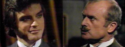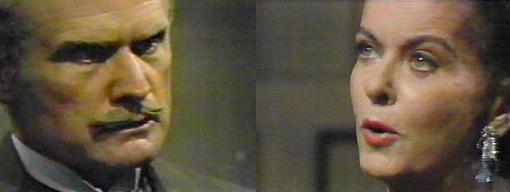 10:20 PM - Quentin tells Edward, I know you and Kitty were in my room--why? Edward doesn't want to answer, but Quentin insists. She had a seizure, says Edward--I saw it, too. And you believed it? asks Q.  Yes, says Edward--and I find your distrust of Kitty unforgivable. And I, retorts Quentin, find your trust of her equally upsetting. Oh, you do? asks Edward, you know how close Gerald, Kitty and I were! Do you know everything about them? asks Quentin.  Of course, says Edward.  With all of your information, says Quentin, do you know that shortly before Gerald Soames died, he was released from prison? This shocks Edward. You're mad, he says. No, Blackmoor Prison, says Quentin, convicted of a common jewel robbery.