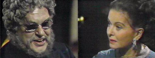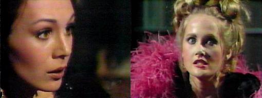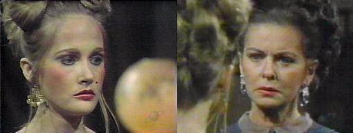 Down in the foyer, we see Barnabas' portrait. Judith asks Edward, doesn't anyone have any idea why Charity thinks she's Pansy Faye?  I think it's a spell Barnabas put on her, says Edward. The spell should have ended when Pansy killed Barnabas, says Judith. I would have thought so, agrees Edward, but obviously not. And no one tried to help the poor child? Chastises Judith-just sat idly by, let her leave Collinwood to lead a cheap, tawdry life?--get Charity for me, demands Judith, I hope to succeed where you have failed. She looks happily, possessively around the drawing room.  Charity comes in and brusquely asks what Judith, what do you want with me. To talk, says Judith--sit down. They both do. I wasn't good enough to talk to when Carl first brought me here, complains Charity. I think I have the only understanding of what's happened to you, says Judith.  Nothing, insists Charity. Listen, please, says Judith, now that I'm back, the house will be run differently, and I will be a good and proper wife to your father. Charity looks at her, surprised--"My father!" she laughs--that would be some trick, considering he's been dead a long time. I'm speaking of your real father, Trask, says Judith. "That old crow that lives here?" asks Charity, making a face--I'd take my own Bertie anytime; whatever his faults, he could be tender, she says, give a smile now and then. Mr. Trask is your father, and I'm his wife, says Judith--and I cannot in good consciences allow you to go on living in town the way you have been. "You can't allow it?" asks Charity sarcastically--"YOU'VE got nothing to say about it!!!" I'll send a servant into town to pick up your things, says Judith. Hold on a minute, you have no right to decide what I'm doing in my life--"And I won't let you do it!" blares Charity.  "What would your mother say if she could see the kind of life you're living?" demands Judith. My mother? asks Charity softly.  Judith continues--your mother was a God-fearing woman who brought you up to be a lady--how would she react to the dress and paint?--how would she like you to walk in singing your cheap little songs?