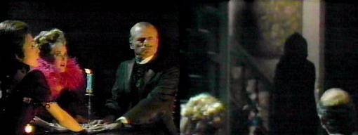 Charity warns, don't break contact--remain seated--we must leave the way open for the spirit to appear to us. "Look in the doorway!" cries Kitty, pointing to a hooded figure standing there. "Who are you?" demands Edward.