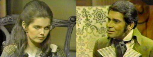 NO! We cannot resist each other, Angelique repeats, but he says he will, he has to, he lost control and he's sorry. She grips his lapels and tells him when two people are drawn to each other, as they are. . . . He says any relationship between them would be. . .quite wrong, for he loves Josette. So, Angelique says, her face furious, you didn't mean all those sweet things you said to me in Martinique (presumably in bed)? Yes, but only at the time, he says, flustered. So it was only an experience of the moment? Don't think of it that way, Barnabas says (even though is sounds that way)? She asks him to leave her room, she wants to be alone. Can they be friends? he quietly asks. "I will always be much closer to you than you think," she promises him, and they exchange a long stare before he leaves the room.