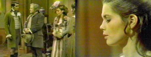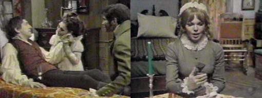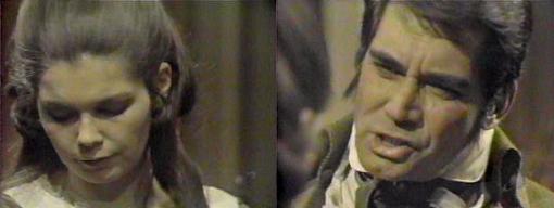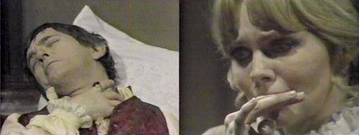If that happens, she'll have no one! She won't lose him! Josette returns with her medal and Angelique flees the scene. She runs to her room and tries to loosen the bonds around the soldier's throat--too tight! She searches for a knife but can't find one, and, growing more and more frantic, finally works out the stubborn knot she had tied around the soldier's throat. (This is one instance where we learn that Angelique is neither a very experienced nor deft witch--there will be others.) Barnabas finds himself able to breathe again--the pressure is gone! Josette, thrilled, kisses her medal. Jeremiah comes in and hears the good news, which is what the doctor had suggested might happen. Josette, tearfully grateful, holds his hand against her cheek. Barnabas said that when the pain was most severe is when it stopped--he was a moment from death, he could feel it whispering to him.