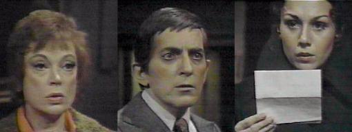 Collinwood - 1:05 - Barnabas tells Julia, if Jeb is involved in Maggie's disappearance, Jeb knows nothing about it--I kept hoping he did--at least we'd have some idea where she is. Julia finds a note, in Maggie's handwriting, lying on the floor. Maggie writes to Barnabas--"I won't be able to meet you tonight, when I got back, there was a call from my Aunt Louise, who is on her way to Montreal to spend a few days at the Hotel Earl--I haven't seen her in a long time, so I went to meet her there--I'll be back in a day or so. See you when I get back, Love Maggie." I wonder how we ever missed it? asks Julia--it must have fallen from the table. We would have seen it by now, says Barnabas. Julia points out it is Maggie's handwriting. Barnabas picks up the phone to dial the Hotel Earl. At that moment, Maggie, blue suitcase in hand, returns home. Julia and Barnabas stare at her, shocked.
