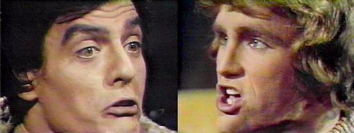 Jeb sits on the steps in the antique shop, covering his ears like a kid during a thunderstorm. When the sound subsides, he cautiously looks out the window. Barnabas enters and asks Jeb, are you going somewhere? No, I was just listening to the night, responds Jeb. It's a beautiful night, the moon so full and clear, says Barnabas. Jeb agrees, but--it would be a beautiful night if I had Carolyn. You'll have her at the proper time, says Barnabas. Angry, Jeb says, I don't think I'm going to make it to the proper time. The time of the Leviathans is a long time in coming, says Barnabas. Don't give me that stuff, says Jeb--how do those people who lived so long ago know how I feel about Carolyn now--and I want her now! Her mother wouldn't have taken her away unless she needed the rest, points out Barnabas. Her mother wouldn't have taken her away if you hadn't told her to, corrects Jeb. We're on the same side and it would be better if we didn't quarrel, says Barn. Are we on the same side? asks Jeb. YES, says Barn, excuse me--I'm going home. Prove we're on the same side before you go, insists Jeb--tell me about the werewolf. There's no such thing, says Barnabas. Don't tell me there's no such thing, says Jeb--such ignorance doesn't become a man of your history--you know there's a werewolf, and you know he's here. There has been talk of a strange animal in the woods, admits Barnabas, but it's hard to tell in a village like this what is legend and what isn't. There's a werewolf here, insists Jeb, and he senses I'm here. I didn't know the werewolf was your enemy, says Barnabas. Now you do, says Jeb--listen more closely to the legends--I must find out where he is, who he is--and kill him before he kills me! cries Jeb, looking as if he's about to cry. Uh oh, thinks Barnabas.