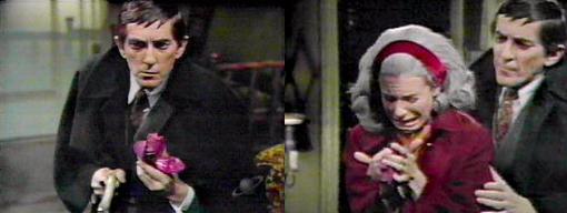 Sabrina enters, sees the flower in Barnabas' hand and screams in misery, taking the ruined petals into her own. Barnabas tries to comfort her, re-introducing himself--I'm trying to help Chris, too, he says. Nothing can help him now, she sobs. Don't think that way, says Barnabas. What other way is there to think? she asks bitterly--he's going to be killed tonight, I know it. You only fear it, amends Barn. No, she says, staring down at the flower, I know it, he will be killed as surely as this flower is destroyed, and it will be my fault--if I hadn't brought the flower, he wouldn't have stayed here by himself--he wouldn't have been able to get out into the woods where someone could get him! Barnabas assures her--he's gone out there before, he'll come back alive. Not this time, she moans, I wish there was some way to tell him I only wanted to help--I wish I were in the woods with him now. Even if you were, you couldn't make him understand, says Barnabas--tomorrow. No, tonight, insists Sabrina, it's the only way I can save him. You're frightened, upset, saying things that make no sense, insists Barnabas. They do make sense, she says, I don't know why, but they do--I am the one person he won't hurt, or kill--he didn't kill me before, and won't now--that's why I must go to him. You're going home, says Barnabas, and I'm taking you there! No, she cries. Then I'm giving you some brandy (?) because we must talk about it! he says. There's nothing more to say, says Sabrina. There's a great deal more to say, insists Barn, pouring a brandy, because when Chris is himself again, the desire you have to help him will mean the only thing...he turns and sees she has gone. Come back! he calls out to her--you can't go into the woods alone--but she doesn't respond. He heads into the woods to find her, still screaming her name.