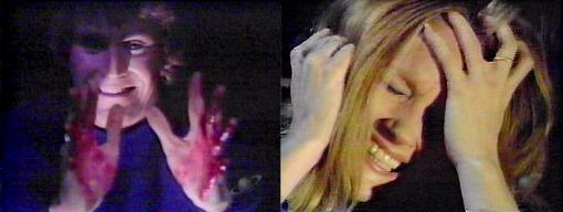 The windows in Carolyn's room bang in the storm, and she gets up to close them. As she's about to return to bed, she hears what sounds like breathing interspersed with clanking chains. Come quickly! Carolyn begs Sky. The double doors of her room blow open. Carolyn screams shrilly. (That gal's got a great set of lungs.)