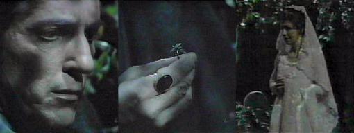 Barnabas goes to Josette's grave. Everyone is ready to go, to move against the Leviathans, except me, muses Barnabas--I can't as long as I have any doubt about you, Josette. Her music begins to play. Barnabas calls, "Who is it? Who's there?--Josette, is that you?" She appears, lovely in her wedding gown and veil, minus the protruding golf eyeball. It is I, she says, and I will tell you what you must know, how and forever. "You asked me if the Leviathans held me prisoner," she murmurs, "they do not, but you hold me, just as I hold you with my love--but now the time has come for both of us to go free." I cannot be free without you, protests Barnabas. "But you must," insists Josette, "for I belong to the past: for you there is a future, with someone else." But I don't want anyone else, says Barnabas. "Then you must be lonely, for you cannot have me," she tells him sadly--"But you will find someone else, I know it, and when you do, give her this." She hands him a ring. "The ring that you gave to me, give to her," says Josette, "whoever she may be." Barnabas takes the emerald and diamond ring into his own hand.
