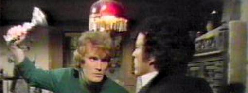 949 - Where were you going, Philip? asks Jeb--"You're going to take that box to someone, weren't you?" Stammering, Philip finally answering yes, but refuses to tell him who. You don't have to tell me who, taunts Jeb, there's only one person it could be--and he's fooled me for a long time, but no more. Jeb takes the box away from Philip and says, if Barnabas wants the box, he can have it. This generosity puzzles Philip. Jeb adds, "When I'm ready. Philip, I'm a very obliging fellow," says Jeb, turning on the light--"I give people exactly what they want. You, for instance, made it clear from the beginning what you wanted is death--you couldn't have been stupid enough to act the way you have from the beginning unless you wanted to die, so I can only assume... " No!" cries Philip. Jeb, reaching for a candleholder "...I'm going to give you what you want tonight--right now!" Again, Philip cries, "NO!"