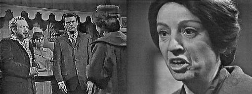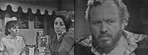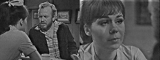 Coffee shop - Maggie drinks her coffee and watches her father, telling him that if he doesn't start talking to her, she's going to start making him pay for his breakfast. I'll pay, he says, how much? I was kidding! she says--you used to be able to see through my jokes before I even made them! Maybe I'm getting old, he says. You're still a young man, she says, you just act childish. Mrs. Johnson comes in and sits at a table. Maggie bids her good morning and offers her a menu. No, thanks, she says. That's too bad, she says, I type these up myself and I'm kind of proud of them--not one typographical error! I'll have vegetable juice and whole wheat toast, well done, she says--I'll butter it myself--and coffee. Coming right up, says Maggie. She goes behind the counter and quietly tells Sam, "She's a bundle of laughs!" Why should she be? asks Sam. Do you think I ought to mention anything to her about Carolyn wanting Mrs. Stoddard to hire her as a housekeeper? asks Maggie. No, says Sam, I don't, what goes on up at Collinwood is none of our business. Right, says Maggie--I don't trust her. Why not? asks Sam. Female intuition, I think, says Maggie. Burke walks past Sarah and goes to the counter. He accepts coffee from Maggie and he and Sam greet each other almost as if they were strangers. How are you? asks Burke. Fine, says Sam, how are you? Couldn't be better, says Burke--I suppose you're happy about the verdict our coroner arrived at? It was the only possible one, says Sam. Maybe you're right, says Burke, but I don't think so. Nobody had anything to do with Bill Malloy's death, says Sam. Sarah jumps from her chair. Oh, yes! she cries, someone had something to do with it, and that someone is standing right there--Burke Devlin! Maggie, Burke and Sam all goggle at her, stunned.