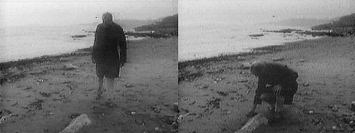 looking in the sand. He tosses a rock into the sea, then walks on.