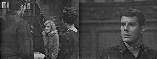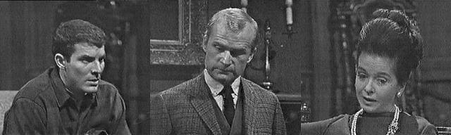 Just what do you think I was doing? he asks guiltily. Practicing a new dance step, she says. Oh, he says, pleased and relieved, unfortunately, not--I was trying to remember something, but it wasn't very important--are you looking for something? Not something, someone, she says, I can't find David anywhere, he seems to have vanished into thin air. Not exactly, he tells her. You know where he is? she asks, sitting on the sofa. I received a call that he was at the Collinsport Inn with Burke Devlin, reports Roger. This surprises Vicki, who suggests she go get him. By the time I got there, says Roger, he had already left, alone, and I didn't see him on the road as I drove home. He's probably gone to his favorite haunt, the Old House, says Vicki. Just the sort of hideout my son would choose, smiles Roger. He'll probably come home when he gets hungry, she says. Oh, Vicki, says Roger, have you heard anymore about my sister hiring Mrs. Johnson to work here? As far as I know, she replies, no more has been done about it. I hope that you can dissuade her from bringing her on here, says Roger, because I dislike having strangers around the house. Not so very long ago, I was a stranger myself, she reminds him. That's quite different, says Roger, you have come from out of town without local connections--if we bring Mrs. Johnson here, I'm sure she'll want to bring all her friends here, and the place will be flooded with local curiosity seekers--I'm not too keen on Mrs. Johnson hovering about. Roger, says Liz from the doorway--will you stop interfering with the running of my house?--the responsibility is mine! Really, Liz, begins Roger, and Vicki hastily excuses herself, saying she has something to do. Of course, says Liz, and Vicki exits. Liz closes the doors and says, "Now, Roger..." I know Collinwood belongs to you, my dear sister, says Roger sourly, but since David and I are living here, it seems like we could be consulted before you bring strangers in off the street. Mrs. Johnson can hardly be considered a stranger, says Liz, she was Bill Malloy's housekeeper. She will be a constant reminder of Malloy's death, says Roger. You're being ridiculous, she says. I don't want to think of the way he died, says Roger--he was practically brought in on our very doorstep. I want to spend less time in the house and more on other things, says Liz--like David--since you never have any time to devote to your own son. What's Vicki for? asks Roger--that's her job. She's his tutor, not a constant companion, says Liz--I want her to spend more time with Carolyn. I see, all right, says Roger nastily--if you, Carolyn, David and Vicki are satisfied, then I suppose I have nothing to complain about! No you haven't! says Liz. If you're so concerned about my son's choice of companions, says Roger sarcastically, how is it he's gotten so chummy with Burke Devlin? Liz, sitting on the sofa, looks up at him.