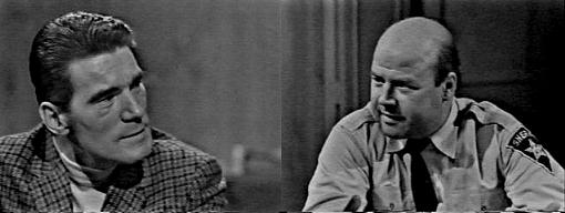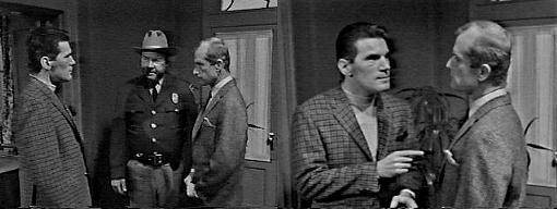 Back at the coffee shop, the waitress refills Burke and George's cups of coffee. Don't you have anyplace else to go? asks the sheriff. No, says Burke. That's too bad, says Patterson. Roger Collins had that pen in his possession the night he left the house, says Burke, but he didn't have it when he got to the meeting--so that means he must have lost it along the way. Or at his home before he left his house, says Patterson. Don't you think you should question him about it? asks Burke. No I don't, the case is closed, insists Patterson. But you can reopen a case with new evidence, says Burke. There isn't new evidence! Says Patterson. Aren't you even going to ask him about it? says Burke. About what? asks Patterson, a fountain pen and a hare-brained notion of yours? Ask Roger Collins where he lost that pen, says Burke. I don't care where or even if he lost it, says Patterson, I told you before, I searched Lookout Point from top to bottom. But not the beach, says Burke. No, says Patterson, I didn't--call me a lousy cop, call me anything you want--just get off my back about this, will you, and stay off? All I want to do is find out who killed Bill Malloy, says Burke. The coroner brought in a decision of accidental death, says Patterson, and that settled it--there's no reason in the world for me to ask anybody about anything. Sure, says Burke, it's more comfortable for you to sit here and drink your coffee--enjoy it, sheriff, make sure it's hot and enjoy your coffee. I give up! says Patterson, standing and putting on his jacket. Don't leave for my sake, says Burke. No, for my own, says Patterson, before I throw a punch I'll be sorry for later. He claps his hat on his head. Fountain pens, he says sarcastically to Burke, and leaves.