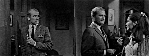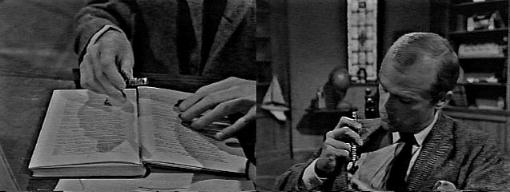 Roger comes downstairs and answers the phone--it's Burke, who wants Roger to meet him at the Blue Whale. Roger doesn't think they have anything to talk about. I'll expect you here in 10 minutes, says Burke. You can wait 10 hours as far as I'm concerned, Roger tells him. Don't be so abrupt, says Burke--all I want is something of mine you happen to have. What's that? asks Roger. My fountain pen--you will bring it with you, won't you? asks Burke--and hangs up. Roger, perturbed, gazes at the phone, then upstairs.