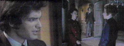 Dameon, says Angelique, I gave you every opportunity to go away and leave me alone, but you refused--I did what had to be done. You mean you got Bruno and Trask to do it for you? he accuses (I definitely get the idea there was dialogue before this, but they cut it out).  Bruno loved me the way I wanted to be loved, she says. No man loved you like I did! says Dameon. She holds up her hand and orders, stay where you are, don't come any closer--keep looking into my eyes. I know you want your death revenge, I cannot blame you for that, but I cannot allow it--I have laid many plans here, and I won't have them upset by you or anyone else. And I won't rest until Quentin knows the truth about you, promises Dameon.  You will rest, Angelique assures him--I summoned you here and I can send you away again--you had to appear because I used the candle of the seven secrets, they can bring you here because they have control over life, and they can send you away again because they control death--they can send you back to your grave forever. He assures her, the candles have no power over me. Try to move, she suggests, to lift your hand and snuff out the candles. I can't move! cries Dameon.  I have a hold over you in death, too, she says--you see, and when the seventh candle appears, you appeared, when the seventh is snuffed out, you will return to your tomb and never appear again. NO! shouts Dameon, you can't do it!  Poor Dameon, croons Ang, putting out the candles, just as handsome and charming in death as you were in life--and every bit as meddlesome!--but not for much longer--goodbye, Dameon.