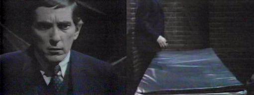 Stokes is about to enter the tomb when he hears someone coming and hides behind a column. Dogs howl as Barnabas enters the mausoleum. Stokes comes out of his hiding place, wondering to himself, what brings Barnabas here--how much has he discovered? Barnabas opens the secret panel as Stokes watches from outside the gate--he knows that, too? Stokes muses--he knows far too much--he must have the girl--is she in there? Barnabas lights the red candles in the little room. Someone's been here, he realizes, it's been cleaned up--is someone actually living here?--could she have come back here after all?--is this the place where I might find her?--the dagger, the one thing in the room that didn't frighten her, is gone! Stokes, standing outside the secret panel, checks his watch and quickly leaves the tomb. Barnabas finds a cufflink on the floor, and reads the initials aloud--"CN. Claude North, of course!"