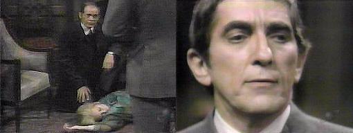 Barnabas kneels to take Angelique's pulse--she is dead. He rises and, looking sad and beaten, picks up the phone in the foyer and calls Inspector Hamilton--Alexis Stokes is dead, he reveals, just a moment ago. . .come here first--I'll be waiting for you.