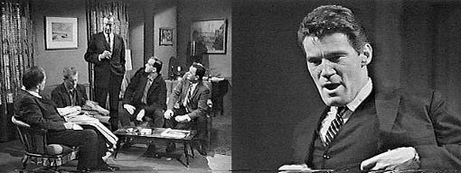 While Blair lights a cigarette, Blair brings out two bottles of booze. Four men enter his suite--Sam, Ezra, John and Amos. He shakes their hands and introduces Amos Fitch to his business associate, Mr. Blair--the fishing captain of Collins fleet. Mr. Dare, Mr. Belladou, Mr. Cartwright (Blair shakes their hands)--all top men for Collins--I've know these men a long time--we're good friends, aren't we? You said we had a business proposition to talk over--what is it? asks Fitch. Same old Fitch, says Burke, never waste time or words, eh?--I like that, I'm the same way--sit down, gentlemen, and make yourselves comfortable. The men sit. I'll come right to the point, says Burke--I'm going to buy the Logansport Fishing Enterprises--my bid is in. The men look at each other. Congratulations, says Fitch, who looks like a Mafia man, but you didn't ask us up here to tell us that, did you? No, says Burke, I asked you up here to make you a very generous offer. Hold it, says Fitch, standing, we'd better get something straight before you go ahead--I'm going to tell you... Just a minute, interrupts Burke, let me finish--hear me out! Fitch nods and sits back down. What I'm about to say might be very important to all of you, says Burke--I'm going to take over the Logansport Fishing Canneries, and I want your help--I know you can make it into a first-rate outfit--and I know I can do it with your help. I thought that was what you were going to say, says Fitch, standing, speaking for myself, I've been with the Collins outfit too long to make a change--I'm leaving the building of new enterprises to you younger men--besides, I like it there--the Collins family has always treated me right--you fellas agree with me, don't you? The other men nod and rise, intending to go. Burke asks them to sit down and hear his proposition before they make up their minds--Amos, you just made my point for me--you've been working a lot of hard years in this business--but what have you got to show for it?--you don't own anything!--if you had to quit tomorrow, it would be really rough on you and your families--I want to see you earn much more than you're getting--and I want to give it to you. Like what? asks Fitch. I'll let Mr. Blair explain what I mean, says Burke. What Mr. Devlin is saying, gentlemen, says Blair, is that it's time your years and experience started to pay off--you'll be making more money than you've ever been paid before, and what's more, every one of you will be in a profit-sharing deal--no more depending on weekly paychecks--this is your chance to earn big money, and don't tell me it doesn't mean anything to you. Fitch looks at Burke. All right, says Burke, let's talk--first I'll give you the details