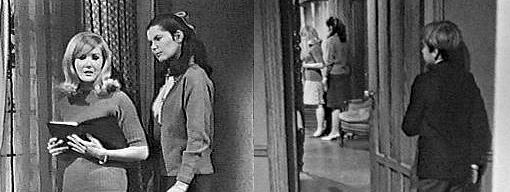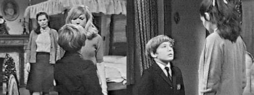 Arms crossed, Vicki asks him what he likes about funerals. Everything, he says--I used to play a game about a funeral, all by myself--sometimes I'd be the dead person, sometimes a mourner, and sometimes the preacher, sometimes all of them. Who was the dead person supposed to be? she asks. My father, he says. That certainly is a morbid game, Vicki tells him. Is it any worse than going around shooting people? asks David, mimicking someone shooting a gun, yelling, "Bang, bang, you're dead!" Oh, so you don't approve of shooting people? asks Vicki. Not particularly, says David, I think there's a better way. Like trying to scare them to death, suggests Vicki sarcastically. What's that supposed to mean? he asks. You father said he scolded you for locking me in that room last night, says Vicki. I didn't know you were in it! he insists. How can you stand there and tell me such a lie? she demands. I thought you had already left, he says, sitting in the window seat. Then why did you yell out, "I hope you stay in here until you die?" asks Vicki. I wasn't talking to you, but to the ghosts, says David. What ghosts? She asks. There are two of them, he says, Josette Collins and another girl, but I don't know her name. There aren't two of them, reveals Vicki, but three of them. All I ever saw was two, he says. Didn't anybody tell you what I saw? she asks--I saw the ghost of Bill Malloy. I don't believe it! says David. You don't have to, says Vicki, I know I didn't believe you when you told me about your ghosts, but I do believe now. David is pleased. What did he do? he asks, talk to you? Yes, says Vicki, he told me to leave Collinwood. Oh, but you can't leave now, he says, you just can't. That's why I'm packing, she explains, I thought you wanted me to leave. That was before I knew he says, that you had seen a ghost--besides me, you're the only one who ever has. What difference does that make? she asks. If they let themselves be seen by you, he says, then that means they like you and want you to stay. Oh, no, he told me to leave, before I was killed the way he was, says Vicki, continuing to pack. Then that means that his death wasn't an accident, says David--I knew it all the time--he was murdered! What makes you say that, says Vicki. If it had been an accident, he wouldn't have come back, says David--the same way with Josette Collins--she didn't fall of Widows' Hill--somebody pushed her! That was more than 100 years ago, says Vicki. Mr. Malloy's ghost will keep coming back for a hundred years, insists David, until they find out who killed him--you must know something about it! I don't, she says. You could know and not even know it, points out David. That's nonsense, she says. It isn't, either, he says, please, don't leave Collinwood. Carolyn enters just in time to hear this, and her mouth drops open. I can't stay, says Vicki. I want you to stay, says David. Did I just hear right? demands Carolyn, entering the room--are you begging Vicki not to leave Collinwood? Yes, she has to stay! he wails. You did say you'd leave it up to David, Carolyn reminds her. This is for an entirely different reason, says Vicki. She saw Mr. Malloy's ghost, David tells his cousin, you can call me anything you want, you can beat me till I'm black and blue, but please make Miss Winters stay here! That's exactly why I came in here, says Carolyn--David, why don't you leave us alone here? I'll do anything you say, he vows--please, Miss winters! David leaves. Wow, says Carolyn, what brought all that on? It would seem that any friend of a ghost is a friend of David's, says Vicki. It's broad daylight, you're not locked up in that room, and there's no thunder and lightning, right? asks Carolyn. Vicki agrees. So now that you think back on it, did you really see a ghost? asks Carolyn--or were you just dreaming? I may have been dreaming, says Vicki, but what I saw was real--I don't mean it that way--it was unreal and supernatural (David listens outside the door) but even if I was dreaming, I certainly didn't dream that seaweed on the floor. He left seaweed on the floor? asks Carolyn. I wrote it all down, says Vicki, taking out a notebook from her dresser, showing it to Carolyn. The first thing I was aware of, reads Carolyn, was a hoarse voice singing an old sea shanty--what will you do with a drunken sailor? That was Bill Malloy's favorite song, says Carolyn. That proves something, doesn't it? asks Vicki.