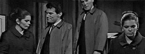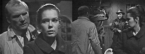 Vicki sits at a table, biting her nails. When Roger enters, she tells him she was never so glad to see anyone in her whole life. Is Burke still here? asks Roger. No, she says, he left shortly after I called you--I told him I was staying overnight here. Has he any idea what you suspect? Asks Roger. No, she says, but I just couldn't face that long drive back to Collinsport with him, knowing perhaps he was a murderer. I don't blame you a bit, Roger assures her. I just couldn't believe that. . she says. Don't worry, says Roger, we have a long time to talk about everything--where's your luggage? The lobby, she says. We'd better get ready, he says--now, all you all right?--he pats her shoulders--you don't have anything to worry about with me. He watches her walk away, putting on his hat, looking like the big bag wolf.