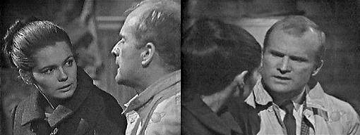 Vicki and Roger run through the storm into the abandoned shack. Roger shakes out his wet hat and asks what she thinks--let's see if we can get this lamp to work. He finds matches and lights the lamp. That's luck, he says, there was some kerosene in it--let's start this fire--you want to bring over some of this paper. She gathers newspapers and Roger finds kindling on the stove, fortunately dry. He rips of the paper and tosses it and kindling into the stove, then tosses in a match--there, I think it's going to catch, he says--well, it's not exactly cozy, is it. Vicki, shaking, says it looks like the bridal suite at the Waldorff Astoria to me! I should have carried you over the threshold, he teases. (Don't go there, Vicki, it will give him some other honeymoon night ideas!) Smiling, she says you forget, you're already married. If you can call it that, he says, unfortunately, it didn't work out that way. He opens his drenched trench coat. David told me you and Laura didn't get along too well, says Vicki. That's an understatement, says Roger--I think we an find many more pleasure things to talk about--let's sit down. She sits on top of a barrel and he sits down on one next to her. I wonder why David would admit he stole the pen, muses Vicki, and then lied about where he'd hidden it. I can't answer that, he says--there's very little about David I can answer--anymore than I can account for his friendship with Burke. Isn't it strange that those two should become friends, says Vicki. Not at all, he says, they're very much alike--they would both go to any extremes to get what they want. You're not like that at all, she says, you seem very confident, he must have gotten that from his mother. I hope he didn't inherit any of her other tendencies, remarks Roger. Thunder booms. I know so little about you, she says--you know everything about me, not that there's much to know--tell me, what do you want out of life? Right now, there are two things I want very much, he says, hugging himself against the cold--I want someone to rescue us from this dank and ill-smelling shack. Vicki agrees with him, and asks what the other one is. I want you to leave Collinwood, he says, startling her.