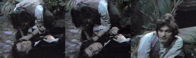 What you did tonight, he says. That I always loved you, she says. I love you, he says, that's why you must live--I love you, Angelique--after all those years, all that happened between us--I can say it now because I know it's true--I love you. Her eyes have closed, however, and, pressing his face to hers, he realizes she is gone. Tears clog his voice as he says, "Angelique....no...Angelique!--you never heard me--you never heard me--oh, my love--my love--he kisses her mouth--you were never to know until it was too late," he mourns. Trask returns to consciousness. Barnabas flies at him. You killed her! he shouts, attacking Trask. The two men struggle. Trask races upstairs, Barnabas vowing, you will pay for this with your life! Barnabas chases after him.
