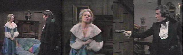 Goodbye, Barnabas, says Daphne, kissing his cheek--God bless you. The dewy-eyed couple leaves. Barnabas, looking uncertain, goes into the drawing room, unaware that Trask, pistol in hand, has exited the kitchen area and is right behind him. Angelique, says Barnabas. Barnabas, says Angelique. I know now, says Barnabas, I know how I feel. Trask enters and raises the pistol.