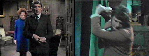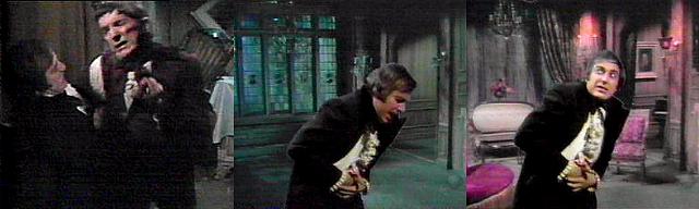 Barnabas forces Trask to drop the knife, picks it up, and drives it into Trask, who stumbles away into the parallel time room, which changes around him. Trask, the letter opener stuck in his stomach, asks "What's happening?" Barnabas watches him from the doorway. "You have escaped me!" he yells, disappointed. Where am I? asks Trask, what's happening, where am I?--and the room changes back to it's empty self. Barnabas enters, staring around. He's gone, he says, clutching his shoulder--he's in that other time!