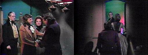 Barnabas enters the drawing room, where Stokes and Julia await him. What happened? she asks. The police accepted my story, he explains--Angelique is to be buried in the family mausoleum. We can't stay here any longer, says Stokes--we must go back to our own time. How? asks Barnabas. I came from 1970 down Quentin's staircase through time, says Stokes--now we must try to go back up those same stairs. (But Barnabas came via E-Ching, what about that?) Barnabas sits listlessly on the sofa. You've done what you came here to do, Stokes reminds him, you'll never know how well you succeeded in changing history until you return to Collinwood--it's 1971 there now--is the house destroyed?--are Elizabeth and the children dead?--are Quentin and Carolyn mad? Barnabas, troubled, says, "Our time, 1971, it seems almost impossible to believe we've come from that time to this--Eliot, we could be certain about what our visit has done to us, but I don't what it has done to Collinwood in 1971?" Desmond comes in and overhears Barnabas' question. What are you talking about? he demands--have you gone mad?--1971?--why it's a hundred and thirty years from now. There's an awkward, silent moment. Finally Julia replies, "But that is where we have come from, Desmond." How is that possible? he asks. We came down Quentin's staircase, says Eliot. Quentin's staircase is a joke! yells Desmond. No, says Stokes, not a joke by any means--those stairs must be destroyed--Quentin intended to destroy them before he left, but I persuaded him not to. You and Julia will leave me here, says Barnabas. No! protests Julia. You must go with us, insists Stokes. Barnabas, says Desmond, all this is beyond me, but if it's Valerie's funeral that is keeping you here, then Leticia and I will stay until tomorrow--my mother will take care of everything. Well, Barnabas, says Stokes, what if you try to go up the stairs and the conditions are not right? You'll never be able to tell if they are right or not, points out Julia worriedly. Barnabas sighs--we will try, he agrees. They all smile at each other.
