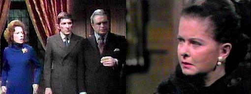 Elizabeth suddenly bustles in, annoyed--"Barnabas, Julia!--really, the three of you are impossible --you're very late!" Late for what? asks Julia. "Have you forgotten?" asks Liz--"the opening of the historical center--I wouldn't have come back, but Roger forgot his speech--so do let's hurry--Eliot, I know that Barnabas and Julia are always pre-occupied, but it's not like you to forget something we've been planning for so long!" Stokes apologizes--it slipped my mind, he says. As Liz looks through papers on the desk for the speech, Julia hesitantly asks, are David and Hallie there? Of course! says Liz. And Quentin and Carolyn? queries Barnabas. Where else would they be? asks Liz, finally finding what she's looking for. Where indeed? echoes Barnabas. Liz tucks the speech under her arm--it's so like Roger, she says--he hates making speeches--why are all of you staring at me so strangely? It's so nice to see you, says Julia. Thank you, says Liz--it's really been a warm and cozy winter, hasn't it?--so calm and peaceful--I've quite enjoyed it--shall we go?--you can drive in with me. We'd be delighted, says Stokes, following her out. I found the most incredible thing in the West Wing this afternoon, says Liz (Mike R. Phone makes an appearance in the corner of the screen)--I'm going to give it to the Historical Society tonight--I found a journal written by an ancestor of mine called Flora Collins (Barnabas exchanges looks with Julia)--I don't believe I've ever heard her mentioned--I understand she's written many novels--we must find and read them. It should be most interesting, agrees Stokes. He and Liz leave the house. So, says Barnabas, the ghosts of Gerard and Daphne never came here. We changed all their lives by being in 1840, says Julia. As well as ours, agrees Barnabas--think back to 1840, Julia, those stairways are likely no more--Desmond has probably destroyed them by now. We'll never forget any of them, says Julia. Never, he says. Together, they walk into the camera--and DARK SHADOWS history.