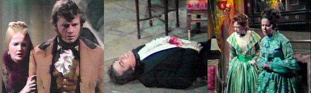 Barnabas grabs Trask's arms; they struggle wildly. Barnabas grabs him in a chokehold and enraged, reminds him--I told you before--when you walled me up--I should have finished you then! Trask's eyes bulge; he falls unconscious to the floor. From the sofa where she has fallen, Angelique calls softly to Barnabas, who runs to the doorway and bellows "Julia!!!." He returns to Angelique and sits beside her. She'll do you no good now, Angelique says, her voice faint. He gathers her into his arms and says, "Oh, my darling." I'm dying, she says. No, he protests. Hold me, she asks. He does. He reaches into his pocket for a handkerchief and wipes away the blood running form her chest wound. Angelique, he says, I never knew. What? my darling, she says.