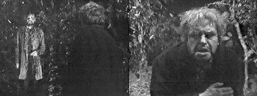 Matthew walks through the woods. Matthew Morgan! calls a ghostly voice. Who's that?--who's there? asks Matthew. Bill Malloy's ghost appears to him. Who's callin' my name, who are ya? demands Matthew, what are ya? The man you killed, says Malloy. You can't be Malloy, says Matthew desperately, Malloy's dead--the dead don't come back! I was Malloy, says the ghost. You can't be, that's not possible, says Matthew. Someone at Collinwood will die tonight, says Malloy--someone will die--someone will die--someone will die. Malloy's ghost turns away and disappears.