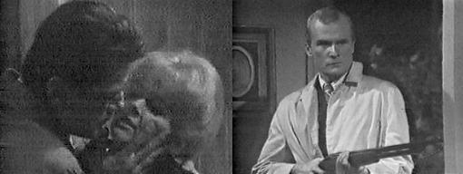The front door opens as Burke is about to plant a kiss. Roger stands there, intensely angry, rifle aimed directly at Burke.