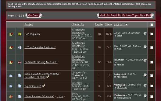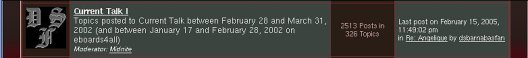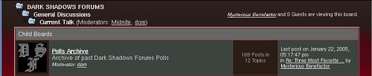In the case of Current Talk, the top of its Message Index page begins the listing for the first child board: the Poll Archive board:
