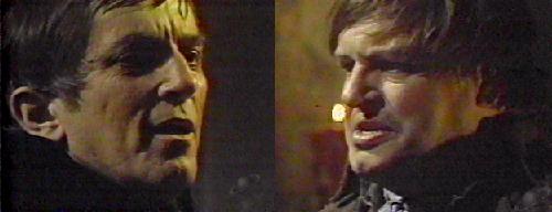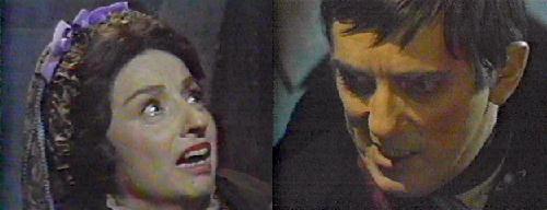 "Feel the flesh and know the truth!" he sneers. Barnabas demands to know why she believes the devil always wants to touch HER, and reveals that he killed Angelique. He will be alive for all eternity, he harshly informs her, and will do anything to protect his secret--kill anyone! On the cold Old House steps, he forces his aunt to look at him, and when she sees his fangs protruding from his wide-open mouth, she saves him the trouble of killing her and conveniently dies of a heart attack. This is one death most of us will applaud and not blame Barnabas for one whit. Excellent performances from both actors!