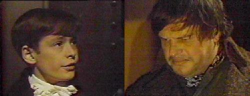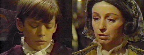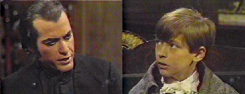 Abigail later catches Daniel trying to sneak out of Collinwood. She grabs the list in his hand and doesn't believe it's his birthday list--what boy asks for boots for his birthday? Why has he made this list; he's a child? Grownups are the only ones allowed to make lists. He sniffs that grownups make lists because they can't remember anything, which pisses Abigail off. She sits him down in the living room and questions him vigorously about what Vicki told him and Sarah. She apparently clued them in to airplanes, radio and doing math by machines. What about Vicki's bracelet, with the devil on it? demands Abigail. Did she make you worship it? No, says Daniel.