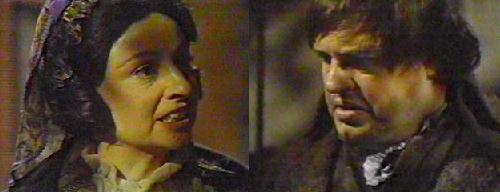 In one of DS' best scenes, Barnabas pursues his terror-stricken Aunt Abigail around the Old House basement, telling her she doesn't know everything, that a person can be both alive and dead, that while she thought she knew everything and had all the answers, she knew nothing, that Angelique, who had helped her and Trask (who Angelique knew had no real power), was the witch who cast all the spells and cursed him. Abigail thinks him a vision, a ghost sent by the witch to torment her, but Barnabas grabs her hand.