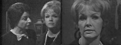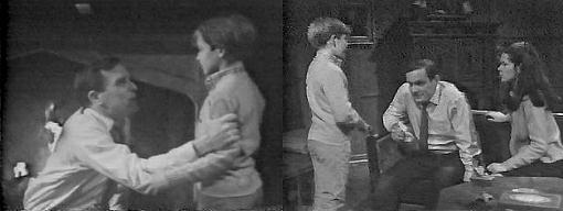 Peter wipes his perspiring face with his handkerchief. Are you all right? asks Vicki. Yes, says Peter, mopping his face, I just got my wind back. What happened? she asks. She... begins Peter, then looks at David and tells him it's time he went upstairs to start getting ready. OK, says David. Come right back down here, says Peter--thank you for saving me--for being there when I needed you. I wouldn't have been there if it hadn't been for Josette, explains David, she was right on the step, just pointing to these doors. You mean, says Peter, she was out there and directed you to me? That's it, says David. I guess you'd better thank her for me next time you see her, says Peter. I will, promises David. Better run along, says Vicki. David leaves. What's happening? asks Vicki. I went to Mrs. Collins, he says, threatened to expose her--when I got back here, I could feel her power taking me over--she would have had me all the way if the key hadn't dropped right in my lap--David is the key to everything she wants--she can't do anything without worrying about him. He puts on his jacket and glasses, and explains how David came into the room, and he reached out for him--as soon as he touched him, the spell was broken--because David had made contact with me. I don't see how Josette figures into all of this, says Vicki. Josette has been working here, too, but her powers seem to be different. They represent good, says Vicki. If she's materializing as easily as this, he says, I think our seance is going to be a great success--I've got some things to do before we're ready, he says. Vicki puts her hand on his arm. Are you sure you're all right? she asks. Yes, he assures her, I feel fine. He slowly walks into the foyer--I've got to got to my hotel and get my tape recorder and the rest of my notes, he says--you take David to the Old House and make sure you keep your eye on him--and above all, be certain his mother doesn't get near him--I'll see you as soon as I get back--thanks--goodbye. She smiles at him and says goodbye, then stands there a moment, contemplating. David runs downstairs. Are you ready? She asks. Yes, he says, and I finished all my homework, too. Very good, she praises--I'll be ready in a minute, I just have to tell Mrs. Johnson something--stay here, don't move. He grins and says OK, then slips on his coat, with a bit of difficulty. The doors open and Laura enters. David--I've been looking for you, she says, smiling at him. (uh oh!)