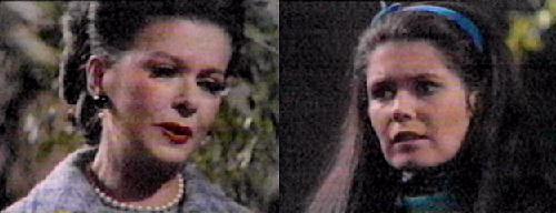 Vicki comes downstairs and overhears Roger reciting love poetry to Angelique's portrait. She smiles, finding the sight amusing and sweet. She asks what he's doing and he doesn't even hear her at first. He congratulates her on her taste--for the fourth time, apparently. He is obviously in love with the portrait--he adores it, he's never seen such a spellbinding face. Vicki still isn't sure why she bought it, but he says the face justifies the purpose. Perhaps I met her in the 18th century, suggests Vicki. Roger doesn't believe she was there; he believes in common sense. Her trip to the past was charming, but it didn't happen, insists Roger. Preposterous. Then what about Phyllis? asks Vicki. Mass hallucination, says Roger--or they're all quite mad. It did happen, maintains Vicki, and she'll prove it to him. Julia enters. He asks her to look at Angelique's portrait. He tells her of Vicki's purchase, and lauds the beautiful face. Julia says she's pretty, but Roger says it's much more. Then he calls Julia Countess duPres, startling her. He doesn't remember doing it when it's pointed out. How very curious, he says, and Julia agrees, gazing with confusion at Vicki (Julia looks lovely here, her makeup and hair gorgeous).