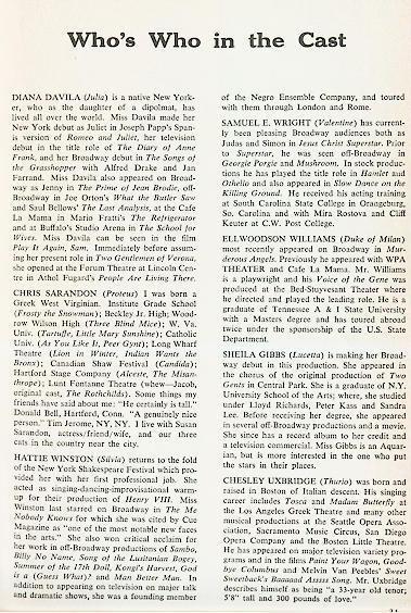 Kosmo graciously provided a scan of his January, 1973 Playbill for "Two Gentlemen of Verona."  It's readable on my PC, but I won't mind typing the text if someone needs it.