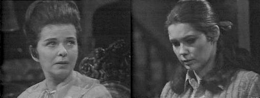 In the foyer, Carolyn tells Vicki she feels something is bothering her mother, something she won't tell her about. Vicki is sure it's in Carolyn's imagination--what would Liz want to hide? Why does leaving this house upset her so much? demands Carolyn. "What keeps her here?" When she first came here, says Vicki, I asked her the same question, and she gave me a very good answer--she said she was waiting for Carolyn's father to come home. Carolyn doesn't believe that anymore--Vicki should have seen Liz' face when she awakened in the hospital, realized they'd taken her away from Collinwood--she was terrified. Vicki points out that she'd been unconscious for five weeks, and to wake up in a strange room would be terrifying for anyone. Carolyn supposes so, but Liz was determined to get back here at any cost. It's normal for a person to want to come home, says Vicki. It's more than that, insists Carolyn, it's something she can't describe, it's as if mother carried some kind of burden she had to keep hidden, and she wants to know what it is, because she wants to help. Vicki tells Carolyn worrying about it won't help her, so stop--Liz is home now and getting well, think only about that. Carolyn agrees, she'll try to stop worrying, but she can't stop her from wondering, no one can.