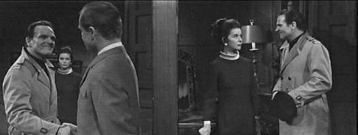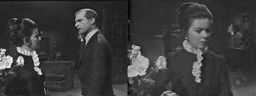 He asks if she got his letter from Tierra del Fuego a few months ago. She tells him she never got it. He says he still admires this room very much--there are some things that should remain unchanged, like Collinwood. It's just as it was 18 years ago, not nice, the last time he saw it, he says significantly--she remembers that night, doesn't she?--that night keeps coming into his head. Yes, says Liz, looking sick, mine, too. Jason suggests they sit down. Liz asks to be left alone with Jason and instructs Carolyn to ask Mrs. Johnson to get some coffee. Carolyn tells Jason it's been wonderful meeting him, and he says more than wonderful for him--see you soon Liz closes the doors and faces Jason. We were about to sit, he reminds her. You may sit, if you wish, she says. He interrupts what she's about to say by remarking how marvelous she looks--18 years might as well have been yesterday, she's exactly as he pictured her, except her beauty seems to have deepened. (What an operator!) She asks what he wants. Would it surprise her to know he doesn't want anything? Then what are you doing here? asks Liz. Just passing through town and just wanted to say hello, says Jason. You aren't the type who passes through a town like Collinsport, says Liz. Aw, now Liz, I think you're hurting my feelings, he chides. It's impossible to hurt your feelings, she says, what are you doing here? He'll repeat it for the second and last time--passing through town. He grins (he's a grinner!) Soon he'll be saying goodbye, farewell, au revoir, and then he'll just disappear over the horizon into the setting sun. When? she asks. Shortly, he says, standing, unless, of course, she wants him to leave this very minute--and his affable manner changes into something dark and threatening. She looks upset, and walks away from him, then says that isn't necessary, please sit down. He's glad to hear her say that--and he sits back down on the sofa. He understands how she feels? Of course, he assures her, it's a natural reaction--but he wishes she didn't have to be that way--he wishes he could feel everything is all right between them. Liz wishes that, too. You can, and will, he says, and he'll be gone before she knows it, and it might be 18 years before she sees him again--or never again. Liz is clasping her hands tightly together. Is that possible? she asks. Of course, he says--he heard she'd been in hospital. She was, but she's much better now, says Liz. Good, says Jason. He's been through a lot, too, that have made him take stock of himself, he's been checking over the pluses and minuses in his life and coming up with a great big zero. What does this have to do with me? she asks. Nothing, says Jason, except the things that happened 18 years ago are very important to him, and how he spent the rest of his time--he'd like to forget it, if possible. Liz sits down and says they agree about that. There, you see, they can get along, he says, putting his hands on either of the arms of her chair, imprisoning her there. He's smiling hugely. Well, now, he says, it wouldn't hurt you to smile a bit. Where are you staying? she asks. Glad you brought that up, he says, he's not really staying anywhere at the moment--to be perfectly frank, he was hoping for an invitation from her. You can't be serious, she says, but he says he's the most serious man alive, and she should know that--there are so many, many empty rooms in Collinwood, seems a shame to have so many empty, empty rooms. This is embarrassing, protests Liz. And the worst of it is, he says, is that you're making me feel unwelcome, and you don't want that, do you, Liz? She can't ask him to stay here! Yes you can, Liz, he says, and you will.